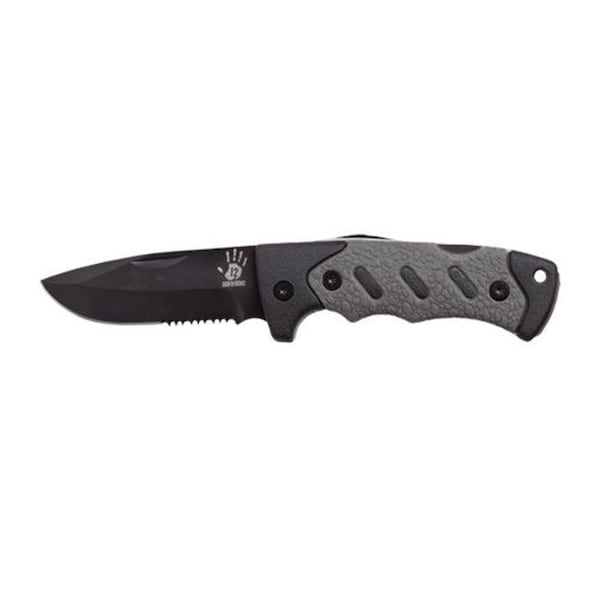 The 12 Survivors Folding Knife is part of the Knife Rollup Kit. A folding knife is essential for outdoor adventures with its ability to fold to a compact size, ideal for carrying in a pocket or being strapped in its nylon sheath. With its rubber coated handle, the knife is great for wet conditions and will not slip out of your hand when in use.