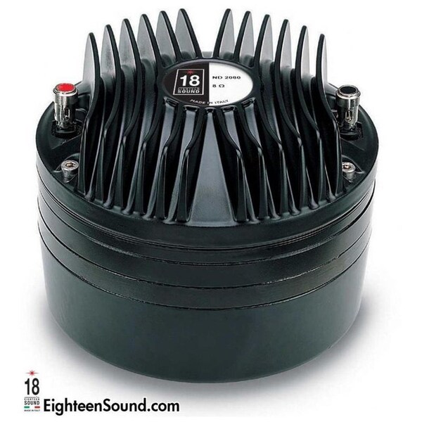The ND2080 2-inch exit high frequency compression driver has been designed for high quality sound systems application. The titanium diaphragm is produced in house and has been developed to assure unmatched transient response. The diaphragm assembly is made by joining the former directly to the titanium dome on its upper bend edge. In comparison with a usual straight former joint, the driver design assures extended frequency energy transfer for improved response linearity and unparallel reliability. This feature allows proper motion control of the dome in real working conditions. A proprietary treated Nomex former is used as Nomex shows a 30% higher value of tensile elongation at a working operative temperature 200 degrees C when compared to Kapton. Moreover, this proprietary former material is also suitable for use in higher moisture content environments. The ND2080 powerful neodymium magnet assembly has been designed to obtain 22KGauss in the gap for major benefits in transient response. The motor structure, throughout the precisely coherent phase plug with 3 circumferential slots and copper ring on the pole piece, reduces inductance effect and distortion. Four top plate air ducts have been designed to act as a loading chamber for the diaphragm, implementing mid band distortion and response figures. The custom designed O-ring creates a tight seal between the plate and the cover assuring air chamber loading. Excellent heat dissipation and thermal exchange are guaranteed by the direct contact between the magnetic structure and the aluminum cover which leads to a lower power compression value. Due to the increasing use of high power audio systems at outdoor events or in marine environments, the ability of equipment to perform properly under inclement weather conditions is a key feature of Eighteen Sound philosophy. Hence, a special treatment is applied to the magnet and the top and back plates of the magnetic structure making the driver more resistant to the corrosive effects of salts and oxidization. This treatment is more effective than any other treatment used by other manufacturers. 110 dB SPL 1W / 1m average sensitivity 2 inch exit throat 3 inch edgewound aluminum voice coil 200 W program power handling Pure Titanium diaphragm assembly Neodymium ring magnetic structure Excellent thermal exchangeThroat Diameter 50 mm 2 in Rated Impedance 8 Ohm DC Resistance 6,2 Ohm Minimum Impedance 8 Ohm at 3500 Hz Le at 1kHz 124 H AES P