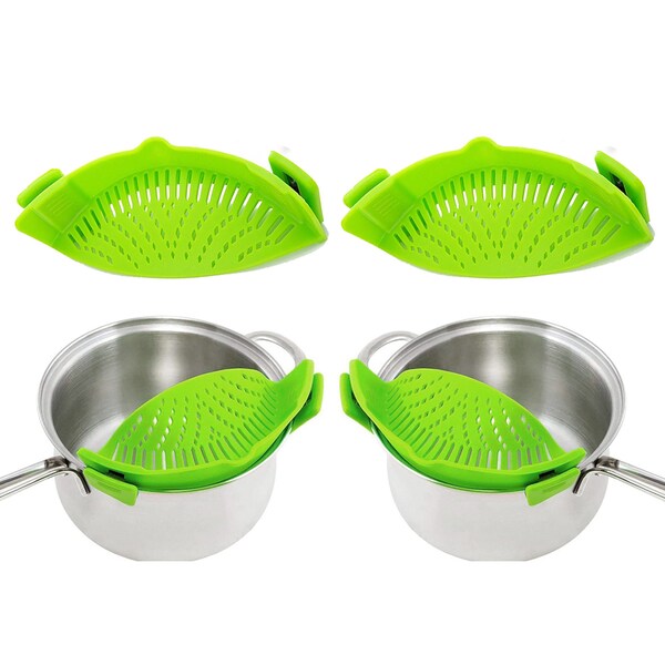 Strain all your favorite foods without dropping odd bits into the sink and splashing boiling water everywhere. The Snap 'n Strain kitchen Strainer is the easiest, most efficient and practical pot strainer that clips on to any type of cookware. Simply clip the pasta pot strainer onto any pot and tilt over the sink or a bowl to strain out the liquid contents. Secure clips will make sure that the strainer doesnt slip off while you strain the liquid. Use for vegetables, potatoes, eggs, grains, pasta etc. HighlightsAttaches easily and securely to any type of round cookware with 2 rust-proof clipsThe spout makes it easier to drain excess waterDurable Silicone material prevents burns, tears and ripsCompact and easy to storeStrains water from food without any food falling out. Heat resistant material Dishwasher safeMaterials: Clip: Stainless Steel; Strainer: Heat-resistant BPA-free Silicone Dimensions: 9in x 4in x 2in