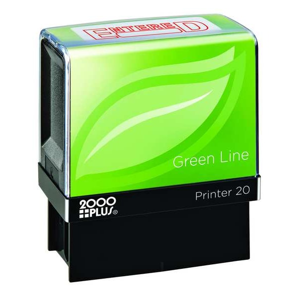 Message Stamp, Legend ENTERED, Stamp Ink Color Red, Font Helvetica Neue & ITC Bookman Std., Character Height 5/16 in, Imprint Area Height 1/2 in, Imprint Area Width 1 1/2 in, Material Made of 65 Percent Recycled Plastic and Metal, Overall Height 2 3/4 in, Overall Length 1 1/4 in, Overall Width 2 1/2 in