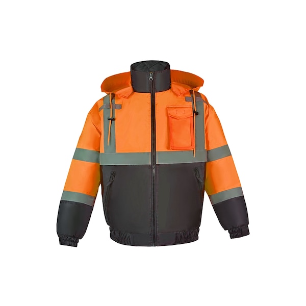 Made from a Polyester Oxford with PU Coating. The jacket is 300 denier and features a 65/35 Poly-Cotton diamond quilted lining with poly wadding, 2 in. wide reflective stripes and 2 mic tabs, heavy duty zippers on front closures and pockets, rib knit waistband and cuffs with adjustable hook and loop straps on wrist cuffs, detachable hood with drawstring and stoppers, and 5 total pockets. Available in lime color with item number 250C-3 and sizes S-5XL.