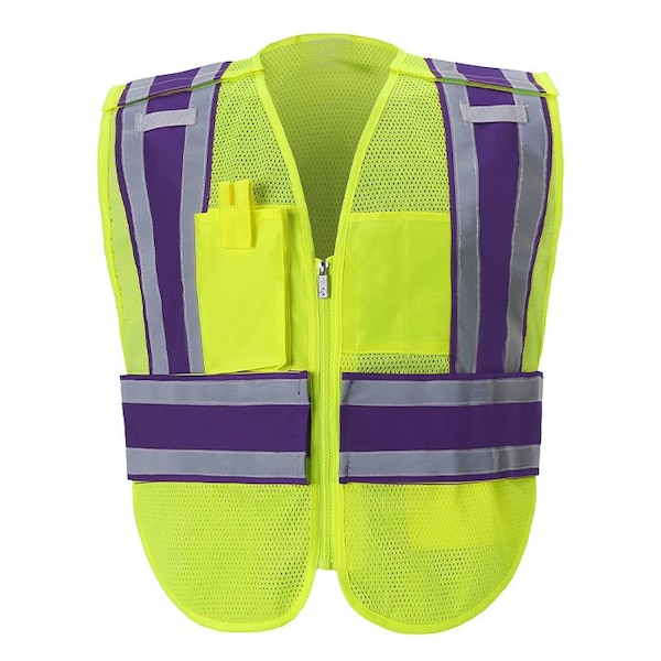 Hook and loop breakaway shoulders and sides.1 wide reflective stripes on 4.5 wide contrasting tape in split design.2 microphone or radio tabs. 2 pockets total: 1 pen/tool pocket, 1 cell phone/radio pocket