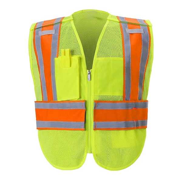 Hook and loop breakaway shoulders and sides.1 wide reflective stripes on 4.5 wide contrasting tape in split design.2 microphone or radio tabs. 2 pockets total: 1 pen/tool pocket, 1 cell phone/radio pocket