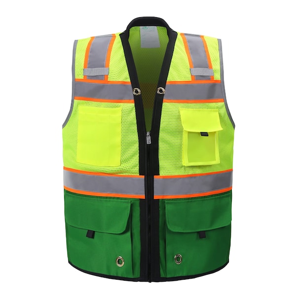 The SV544GRC-2 Green and Lime Premium Surveyor Vest combines durability, functionality, and enhanced safety features, designed specifically for professionals who demand top performance in their high-visibility gear. Available in a sleek Green color, this vest provides exceptional visibility and practical features tailored to meet the rigorous demands of surveying and other fieldwork. Robust Construction: Crafted with a heavy-duty zipper front and reinforced with webbing, it offers exceptional durability and strength. This robust construction ensures the vest withstands the rigors of daily use while maintaining its structural integrity and functionality. Enhanced Visibility: Featuring 2 wide reflective stripes and reflective trim around the arms, this vest ensures high visibility in various lighting conditions, complying with ANSI/ISEA 107-2020 | Class 2 standards. The reflective elements provide crucial visibility for safety in low-light environments, enhancing your presence and ensuring you are seen from a distance. Organized Storage: Designed with a total of six pockets for maximum utility: Two Upper Pockets: The left pocket includes a hook and loop flap closure ideal for an ID badge or radio/mic, while the right pocket features a two-tier design for storing pens and small tools. Two Inside Pockets: The lower left pocket comes with a load-bearing strap, making it perfect for securing a tablet or notebook, while the additional inside pocket offers extra storage space for essential items. Comfort and Practicality: The vest is designed with an ultra-padded neck, providing enhanced comfort during extended wear and reducing fatigue. This thoughtful feature ensures you remain comfortable throughout your workday. Equipped with two mic tabs, it allows for convenient placement and easy access to communication devices, ensuring you stay connected and efficient on the job. Constructed from 100% polyester with an open mesh weave, the vest offers excellent breathability, helping to keep you cool and comfortable even in warm conditions. The mesh fabric is designed to promote airflow and reduce heat buildup. Versatile and Professional: The Premium Surveyor Vest is ideal for a wide range of professional applications, including surveying, road work, and other field-based activities where high visibility and functional storage are essential. The Green color adds a professional and sleek appearance.
