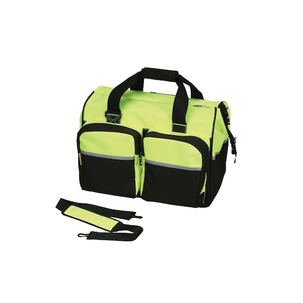 Sturdy webbing handles with Velcro closure and removable shoulder strap. ID pocket and reflective lining for increased visibility. Functionality: wide mouth framed opening at top for easy access. 2 exterior zip pockets and 2 interior zip slash wall pockets. Available in orange as part number GB93-06.