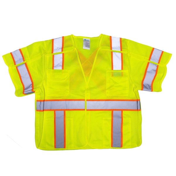 5-point breakaway system at the shoulders,sleeve, sides, and front zipper closure that will breakaway when moderately tugged. 2'' wide reflective stripes on contrast color tape featuring x-back design. 4 pockets total: 1 upper outside with flap, 1 upper outside without flap, 2 lower inside.