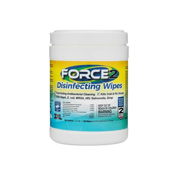 Disinfectant, Disinfecting Wipes, Primary Chemical Quat, Targeted Pathogens MRSA, Norovirus, Salmonella, Wet Contact Time 2 min, Canister, Container Size 220 ct, Ready to Use/Concentrated Ready to Use, Cleaner Form Wipe, Sheet Size 6 in x 6 3/4 in, Application Disinfecting, Fragrance Citrus, Biodegradable No, White, Disposable/ Reusable Disposable, EPA Registered Yes, EPA Registration Number 6836-372-82144, Features Dual Action Wipes, Non-Abrasive, Non-Scratching