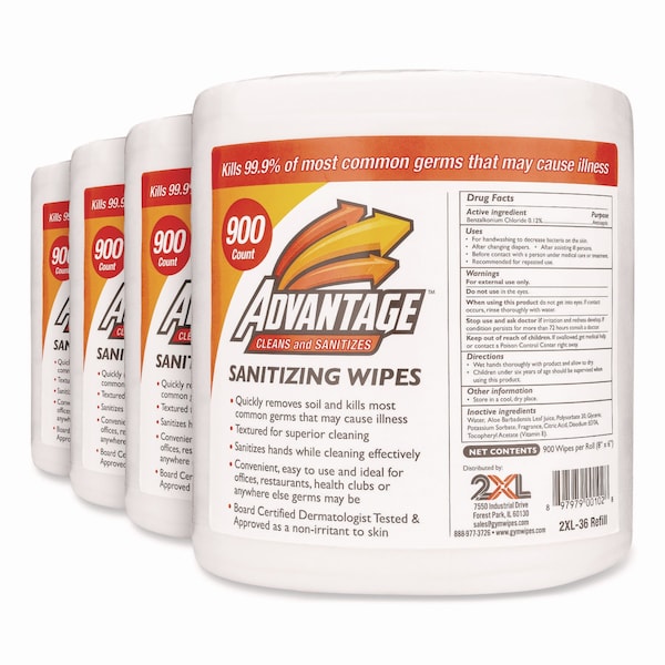2XL Gym Wipes Advantage, 6 x 8, White, Unscented, 900/Roll, 4 Rolls/Ct