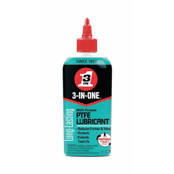General Purpose Lubricant, Wet, 3-IN-ONE, Net Fill 4 oz, Container Size 4 oz, Lubricant Container Squeeze Bottle, Mineral Oil, PTFE Primary Additive, Min. Operating Temp. -50 Degrees F, Max. Operating Temp. 500 Degrees F, NSF Rating Not Rated, 50 State VOC Compliant Yes, VOC Content 24 Percent, Lubricant Color Amber, Odorless Yes, Flammable Flammability, Highly Flammable Liquid (Category 2), Flash Point 29 Degrees F, Standards CARB Compliant, RoHS 2011/65/EU Compliant