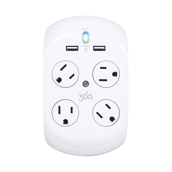 The 36037 is the Revolve surge protector with 4 rotating outlets 2 USB Ports from 360 Electrical. This 4-plug outlet with 360 degree rotating receptacles and 2 USB ports is a non-traditional surge protector that can accommodate up to four regular or oversized plugs and AC adapters as well as features a 918 joule rating to help with electrical surges. This device also contains 2 USB ports with 2.4 amp dual USB fast charging capabilities.