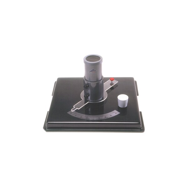 For the demonstration of optical activity, determination of specific rotation, and for determining concentration for a known specific rotation. Demonstration instrument for use on a overhead projector in front of a larger audience. A yellow filter (for more precise measurement accuracy) and a polarizer are embedded in a black plastic base plate. A cell containing a solution of the substance to be investigated with 50 mm and 100 mm markings is inserted into the holder. The analyzer is situated above this set-up in a holder with rotary handle and pointer. By turning the analyzer the rotation angle can be read off an illuminated scale from +40° up to –40° with 1° scale division. Dimensions: 370 mm x 330 mm x 190 mm