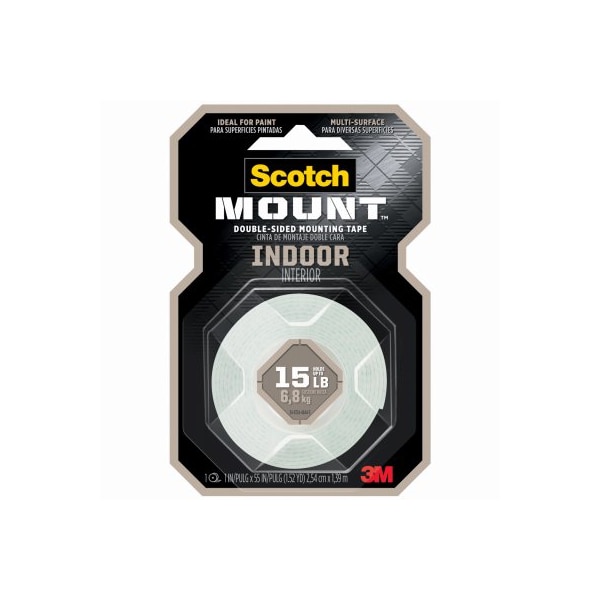 Scotch-Mount Indoor Double-Sided Mounting Tape 1 x 55. This permanent double-sided tape is ideal for painted surfaces and allows you to quickly and easily organize your space. Holds up to 15 pounds and delivers a strong bond every time due to its industrial strength adhesive.