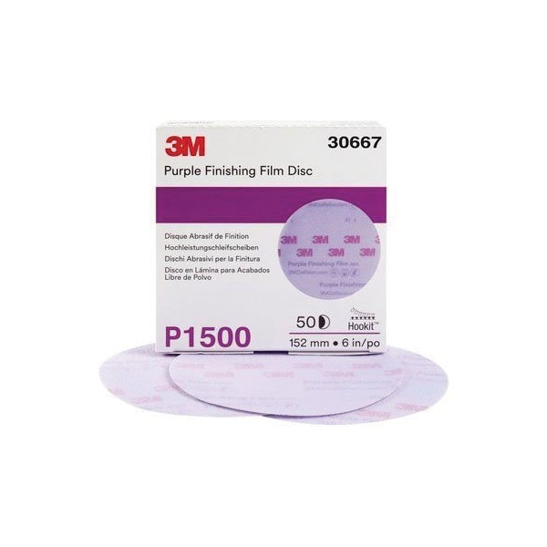 The 3MTM HookitTM Purple Finishing Film Abrasive Disc 260L features an updated coating that levels surface defects on clear coat and greatly reduces pigtails. Aluminum oxide abrasive cuts fast, lasts a long time, resists loading with or without hole pattern designs and leaves a consistent, easy-to-polish finish. The 3MTM HookitTM attachment system makes disc change-outs fast and easy. LONG LASTING: Get an easy-to-polish finish with these fast-cutting, long-lasting abrasive discsSPECIALLY FORMULATED: Engineered to help reduce pigtails and curly-Q'sDURABLE BACKING: The flexible film backing increases conformabilityMULTIPLE GRADES: No-hole or dust extraction designs are available in grades P600-P2000FAST CHANGE-OUT: HookitTM attachment system makes for easy, efficient disc change-outs