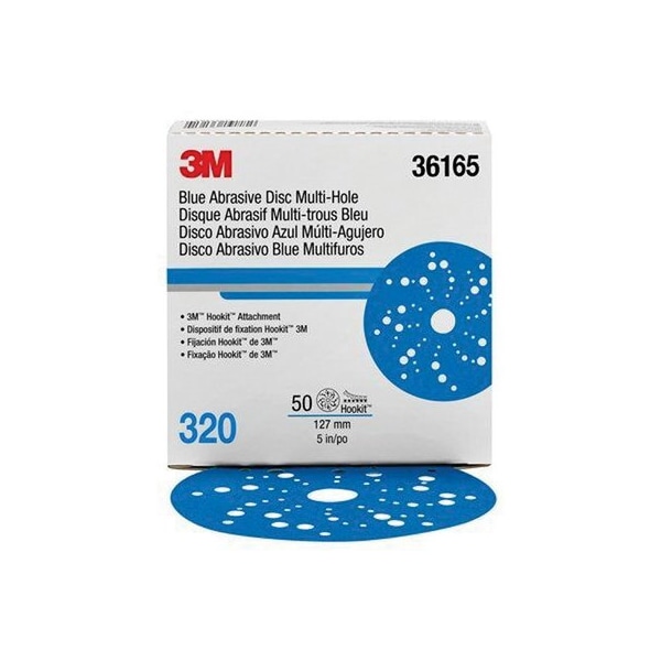 The 3MTM HookitTM Blue Abrasive Disc 321U delivers best-in-class performance at every stage of paint prep and body repair. Premium aluminum oxide mineral abrasive is blended with ceramic grain for a full range of automotive sanding applications. Specially-designed multi-hole pattern reduces loading, extends disc life and aligns with most backup pads. HookitTMattachment makes disc changes easy. QUALITY: Get a best-in-class cut rate and disc life with 320 Grade 3MTM HookitTM Blue Abrasive Discs, a workhorse abrasive for auto repair professionalsMAXIMUM PERFORMANCE: Engineered ceramic mineral blend is balanced for maximum abrasive performance in its classMULTI-HOLE PATTERN: Provides excellent dust extraction to help reduce loading and help extend disc lifeUNIVERSAL DESIGN: Designed to help you get your work done quicker and help you spend less time changing abrasives mid jobEASY CHANGE-OUTS: Change out discs quickly with the 3MTM HookitTM attachment system