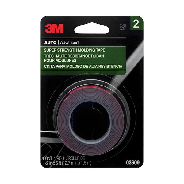 Permanent Bond for Moldings, trim and emblems designed specifically for auto care and maintenance, our 3M Super Strength Molding Tape permanently attaches plastic, metal, carbon fiber and composite parts to your vehicles painted or unpainted surfaces. You can install side body moldings, drip rail moldings or fender and wheel trim to add instant protection against door dings and other hazards. Use this high-strength double-sided tape to add value to your vehicle by quickly installing or restoring decorative interior and exterior trim or factory emblems. The tape adhesive bonds instantly and holds up to impact, moisture and solvents used in routine maintenance. From its convenient roll, 3M Super Strength Molding Tape is easily measured and cut to size for your specific job. It is available in several lengths and widths and can be applied quickly and easily without tools or the mess, mixing and hassle of liquid adhesives. Simply peel off the liners to expose the adhesive and press firmly.