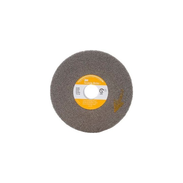 3M Scotch-brite light deburring wheel 6in x 1in x 1in silicon carbide 7s fin our scotch-britelight deburring wheel is uniquely suited to applications where a moderate degree of conformability and density are needed to maintain critical tolerances while proiding a fine polished finish. A unique resin system helps minimize smearing and reduces heat build-up. The light deburring wheel runs cool and resists loading due to its non-woven web construction. We did this to reduce the risk of part discoloration and warping while extending the life of the wheel. The light deburring wheel is available in fine grade abrasive. our scotch-brite light deburring wheel uses fine grade silicon carbide abrasive. Silicon carbide is a synthetic mineral that is very sharp and commonly used for low-pressure applications such as paint prep. While it breaks down faster than aluminum oxide, It prouces a superior finish. scotch-brite industrial abrasives are unique surface conditioning proucts with abrasives incorporated into non-woven nylon or synthetic fibers. Combining abrasives with the fibers creates an abrasive system that delivers consistent results for the life of the prouct. We made this wheel with an open-web material that runs cool and is load resistant, which keeps the abrasive minerals cutting at high performance by limiting clogging of the fibers. applications are deburring, Finishing, polishing builders hardware, medical instruments, metal fabrication, metal implants, plumbing fixtures, turbine engines. industries include builders hardware, medical instruments, metal fabrication, metal implants, plumbing fixtures, turbine engines.