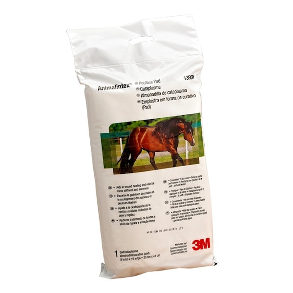 Made of 100% cotton with non-woven cover which has low adherence to wounds. Pad contains a natural poultice agent and boric acid which is a mild antiseptic. May be used as a hot poultice for abscesses, boils, infected/dirty wounds, cracked heels, thorns, laminitis, seedy toe and corns or as a cold poultice for strains, sprains, sore shins, splints, bruises, chapped hocks and elbows. 8" x 16" sheet.