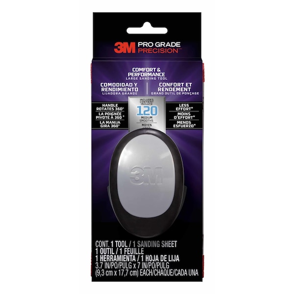 The 3M Pro Grade Precision Comfort and Performance large sanding tool provides easy loading and superior comfort for sanding. It is ideal for large, flat surfaces. With a handle that turns 360 degrees, the tool helps create smooth, consistent results.