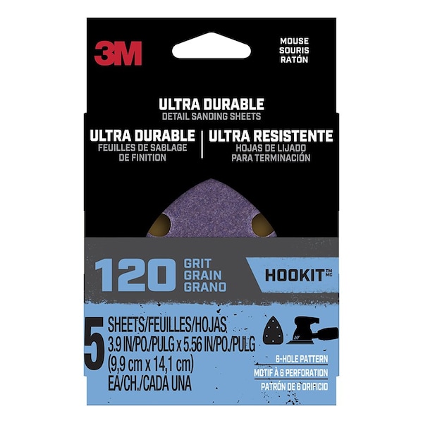 3M Ultra Durable Detail Sanding Sheets, 120 grit, Mouse5pk120, 5/pk, 20/case