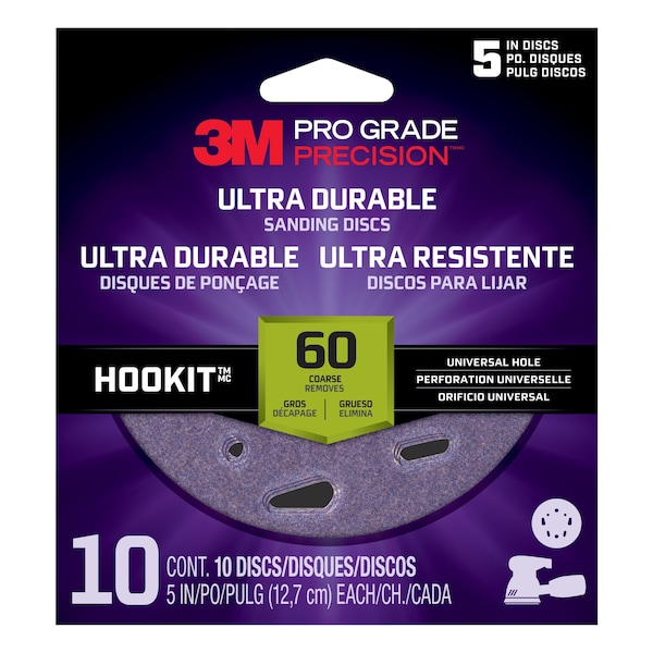 Hard working power tool abrasives that last from one job to the next. Whether you are sanding wood, plastic, or metal the 3M Pro Grade Precision Ultra Durable Universal Hole Sanding Discs are ideal for all stages of sanding. 3M premium mineral technology delivers a sanding disc that cuts fast and lasts long. Use with a random orbital sander. The hook and loop attachment system allows for quick and easy attachment to and removal from the tool. The unique universal hole pattern allows for efficient dust extraction on both 5 hole and 8 hole sanders.
