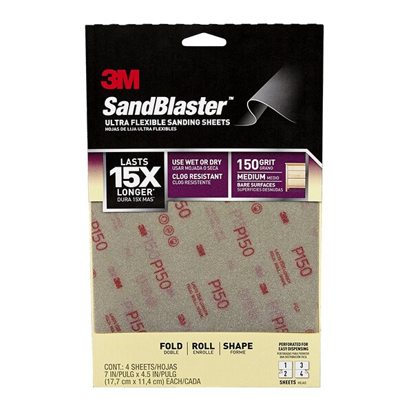 3M SandBlaster Ultra flexible sanding sheets feature an innovative film backing, so you can FOLD, ROLL or SHAPE into any form you need to get the job done! The ultra-flexible sheets last 15X longer than conventional paper-backed sandpaper, are clog resistant and can be used wet or dry. The tough backing resists puncture, tear and creases, helping the sheet keep its original shape.