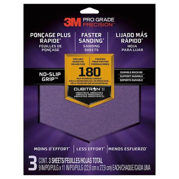 9" x 11" Pro Grade Precision No-Slip Grip Sanding Sheet 180-Grit 3-Pk