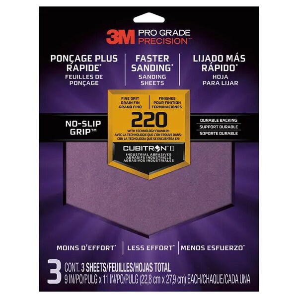 3M Advanced Sandpaper is now better than ever, thanks to our NO-SLIP GRIP Backing that is applied to the back of our 3M PRO GRADE Sandpaper. NO-SLIP GRIP Backing provides longer sheet life - 7 times longer than conventional sandpaper. For the best sanding results, sand with the grain of the wood and work through a sequence of grits, from coarse to ultra fine, skipping no more than one grit between sandpaper..