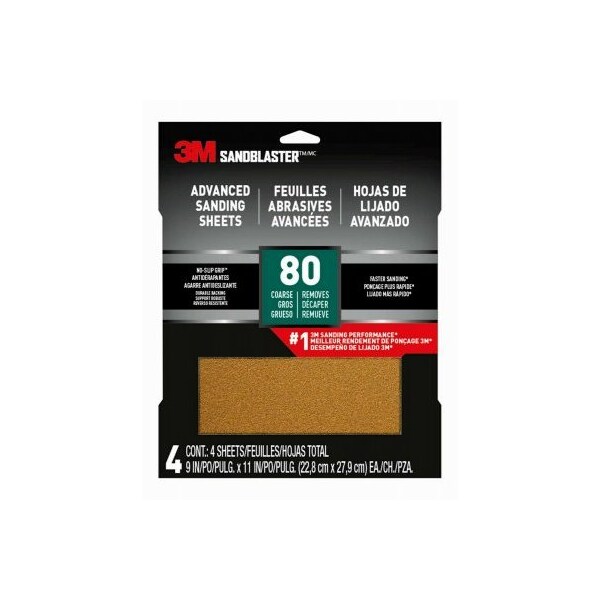 3M Sandblaster 4 Pack 9 x 11 80 Grit Sandpaper With No Slip Backing Advanced Abrasives Are Now Better Combination Of No Slip Grip Backing & Premium Mineral Technology Providing 10x Longer Sheet Life.