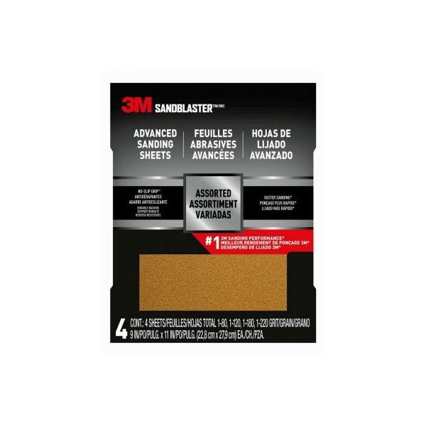 3M sandblaster 4 pack 9 x 11 sandpaper with no slip grip backing assorted advanced abrasives are now better combination of no slip grip backing premium mineral technology proiding 10x longer sheet life.