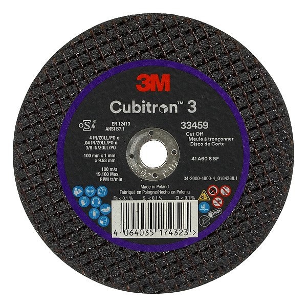 Cut-Off Wheel, Abrasive Material Ceramic, Grit Not Applicable, Connector Size 3/8 in, Connector Type Unthreaded Hole, Overall Diameter 4 in, Overall Thickness 0.039 in, Compatible Tool Type Angle Grinder, Cut-Off Tool, Primary Material Application Aluminum, Steel, Series Cubitron 3, Wheel Type Type 1, Specification Not Applicable, Maximum Operating Speed 19,100 RPM, Reinforced Status Reinforced, Bond Type Resin, Color Black, Package Quantity 5