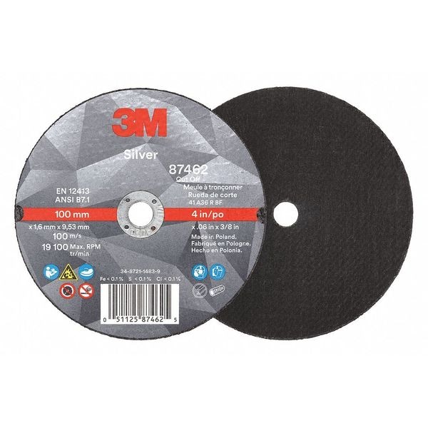 Abrasive Cut-Off Wheel, Abrasive Material Ceramic, Grit 36, Connector Size 3/8 in, Connector Type Unthreaded Hole, Overall Diameter 4 in, Overall Thickness 0.06 in, Compatible Tool Type Angle Grinder, Primary Material Application Stainless Steel, Steel, Series Silver, Wheel Type Type 1, Maximum Operating Speed 19,100 RPM, Color Black