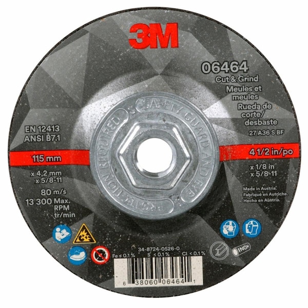 Cut-Off & Grinding Wheel, Abrasive Material Ceramic, Connector Size 5/8 In.-11, Connector Type Threaded Hole, Grit 36, Overall Diameter 4 1/2 in, Overall Thickness 0.125 in, Primary Material Application Stainless Steel, Steel, Compatible Tool Type Angle Grinder, Series Cut & Grind, Wheel Type Type 27, Maximum Operating Speed 13,300 RPM, Color Black, Grade Not Applicable