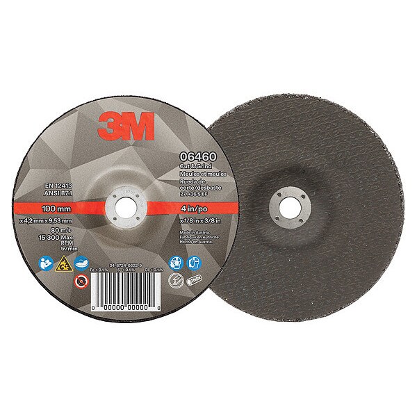 Cut-Off & Grinding Wheel, Abrasive Material Ceramic, Connector Size 3/8 in, Connector Type Unthreaded Hole, Grit 36, Overall Diameter 4 in, Overall Thickness 0.125 in, Primary Material Application Stainless Steel, Steel, Compatible Tool Type Angle Grinder, Series Cut & Grind, Wheel Type Type 27, Maximum Operating Speed 15,300 RPM, Package Quantity 10