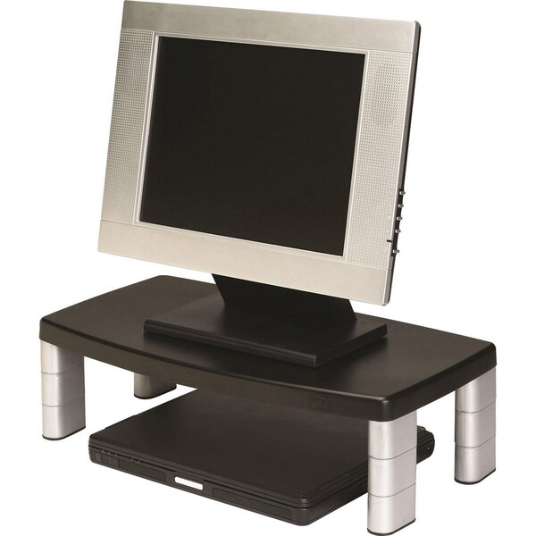 Adjustable monitor stand with nonskid base is designed for laptops, monitors and printers. Stacking columns raise the machine and allow a 16" wide storage space underneath to maximize desk space. The extra-wide monitor raises the monitor from 7/8" to 5-7/8" in increments of 1-5/8" to help ensure the proper viewing angle. It is great for laptops, printers or monitors up to 17" or 40 lb.