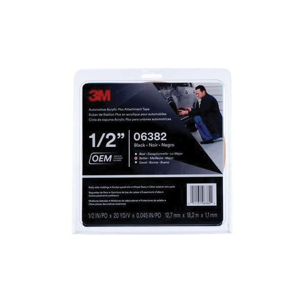 3M Automotive Acrylic Plus Attachment Tape 06382 is a 1.12 mm .045-inch thick, medium-density, black acrylic foam tape with high performance acrylic adhesives on both sides and a red release liner. These tapes offers more robust performance to a wide variety of automotive substrates