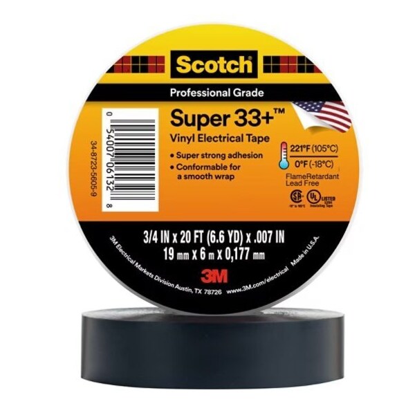Scotch Super 33+ Vinyl Electrical Tape, 3/4 in x 20 ft, Black, 10 rolls/carton, 100 rolls/Case