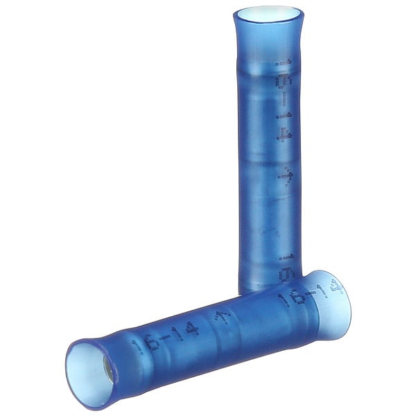 Butt Splice Connector, Connection Type Crimp, Insulation Material Nylon, Insulation Color Blue, Maximum Operating Temperature 221 Degrees F, Maximum Voltage 600 V, Minimum Wire Size 16 AWG, Maximum Wire Size 14 AWG, Standards CSA Certified, UL Listed, Termination Style Crimp, Contact Material Brass, Overall Length 1 in, RoHS Compliant Yes, Seam Style Seamless, Barrel Inside Diameter 0.09 in, Body Finish Tin Plated, Body Material Copper