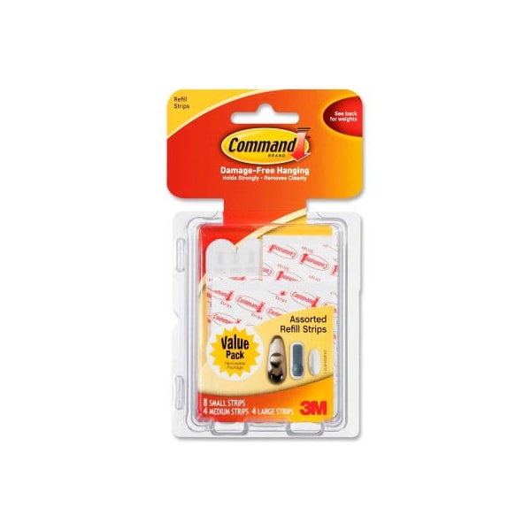 Command assorted refill strips, white, 16/pack make it easy to reuse command products when you redecorate or reorganize. A great replacement for double-sided tape. Holds: 1 lb; 3 lb; 5 lb; permanent/removable/repositionable: removable; hanger/hook type: hook; width: 5/8in; 5/8in; 3/4in. Larger quantity quotes available. Please call 1-888-978-7759. This product arrives to most customers in 2-3 business days.
