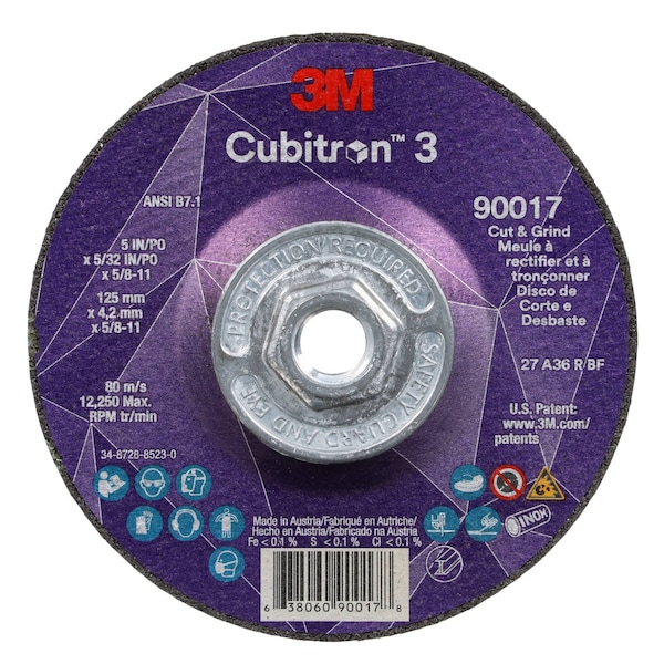 Cut-Off and Grinding Wheel, Abrasive Material Ceramic, Connector Size 5/8 In.-11, Connector Type Threaded Hole, Grit 36, Overall Diameter 5 in, Overall Thickness 0.156 in, Primary Material Application Stainless Steel, Compatible Tool Type Angle Grinder, Series Not Applicable, Wheel Type Type 27, Maximum Operating Speed 12,250 RPM