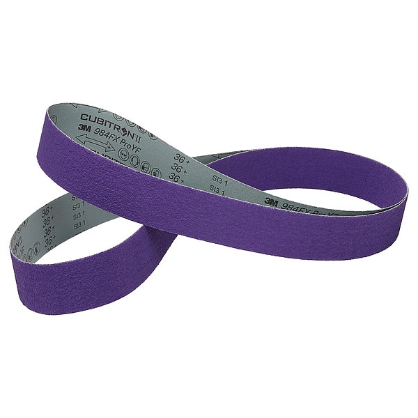 Sanding Belt, Abrasive Material Ceramic, Abrasive Type Coated, Coating Coverage Closed, Grit 36, Series 1184F, Grade Coarse, Overall Length 90 in, Overall Width 1 in, Backing Material Polyester, Backing Weight YF, Flexibility Type Single, Bond Type Resin, Color Purple