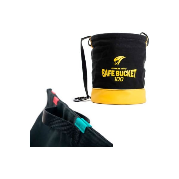 3M dbi-sala 1500134 safe bucket 100lb load rated hook and loop canvas1500134 every 3M dbi-sala safe bucket is manufactured with either a hook and loop or drawstring closure system which helps prevent accidental drops. Heavy-duty 24 oz. Cotton duck canvas innovative hook and loop closure system carabiner and hoisting strap six built in connection points for tethering tools with 10 lb. 4.5 kg load rating each puncture resistant plating sewn into the base of the bucket 100 lb. 45.4 kg load rating 15 in. Height x 12.5 in diameter 38 cm x 31.75 cm