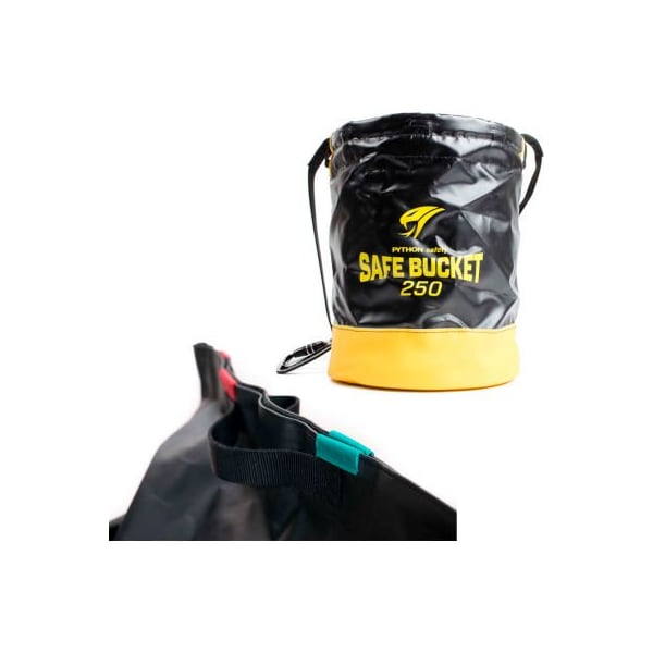 3M dbi-sala 1500140 safe bucket 250lb load rated hook and loop vinyl1500140 every 3M dbi-sala safe bucket is manufactured with either a hook and loop or drawstring closure system which helps prevent accidental drops. Heavy-duty vinyl is easy to clean innovative hook and loop closure system carabiner and hoisting strap six built in connection points for tethering tools with 10 lb. 4.5 kg load rating each puncture resistant plating sewn into the base of the bucket 250 lb. 113.4 kg load rating 15 in. Height x 12.5 in diameter 38 cm x 31.75 cm