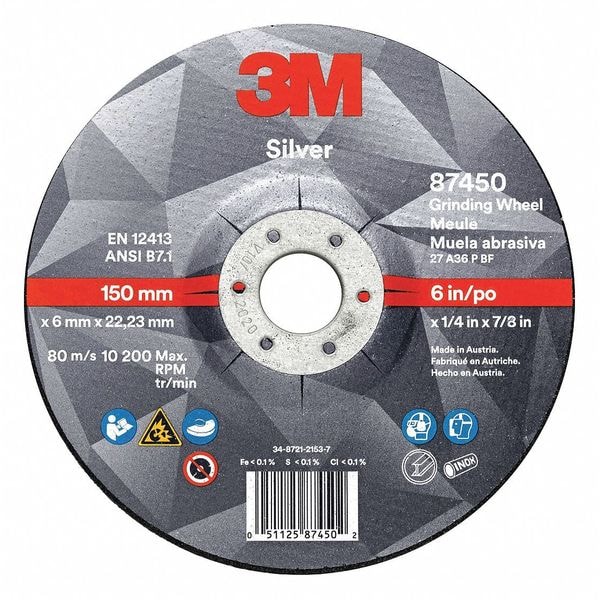 Depressed Center Grinding Wheel, Abrasive Material Ceramic, Connector Size 3/8 in, Connector Type Unthreaded Hole, Grit 36, Overall Diameter 4 in, Overall Thickness 0.25 in, Primary Material Application Stainless Steel, Steel, Compatible Tool Type Angle Grinder, Series Silver, Wheel Type Type 27, Maximum Operating Speed 15,300 RPM, Color Black, Grade Extra Coarse
