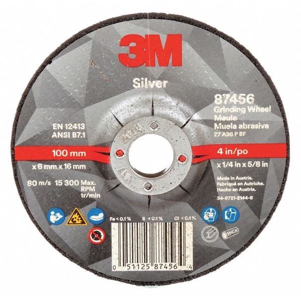 Depressed Center Grinding Wheel, Abrasive Material Ceramic, Connector Size 5/8 in, Connector Type Unthreaded Hole, Grit 36, Overall Diameter 4 in, Overall Thickness 0.25 in, Primary Material Application Stainless Steel, Steel, Compatible Tool Type Angle Grinder, Series Silver, Wheel Type Type 27, Maximum Operating Speed 15,300 RPM, Color Black, Grade Extra Coarse