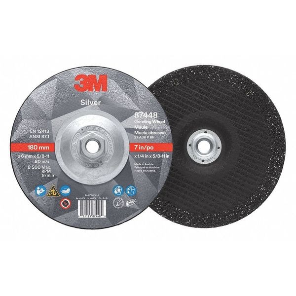 Depressed Center Grinding Wheel, Abrasive Material Ceramic, Connector Size 5/8 In.-11, Connector Type Threaded Hole, Grit 36, Overall Diameter 7 in, Overall Thickness 0.25 in, Primary Material Application Stainless Steel, Steel, Compatible Tool Type Angle Grinder, Series Silver, Wheel Type Type 27, Maximum Operating Speed 8,500 RPM, Color Black, Grade Extra Coarse