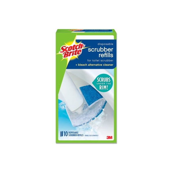 refill pack for scotch-brite disposable toilet scrubbers. all-in-one cleaning that leaves a fresh, clean scent!! non-scratch cleaning. fits under the rim!! refill pack for scotch-brite disposable toilet scrubbers, specially designed with the bathroom in mind. The non-scratch scrubbers are designed to fit under the rim, perfect for that all-in-one clean. It even removes rust and hard-water stains. Press a button to drop the disposable head in the trash. Now, how's that for easy? handle material: plastic; color(s): blue/white.