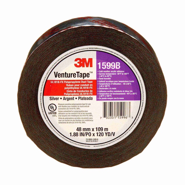 Adhesion to Steel 38 oz/in, Tape Brand 3M(TM), HVAC/R, Environment Indoor/Outdoor, Imperial Tape Length 120 yd, Imperial Tape Width 1 7/8 in, Continuous Roll, Series 1599B, Tape Adhesive Material Acrylic, Tape Backing Material Polyethylene Coated Cloth, Tape Color Silver, Tape Sub-Type Metalized Duct Tape, Tape Thickness 3 mil, Duct and Repair Tape, Maximum Tape Performance Temperature 185 Degrees F, Metric Tape Length 109 m, Metric Tape Width 48 mm