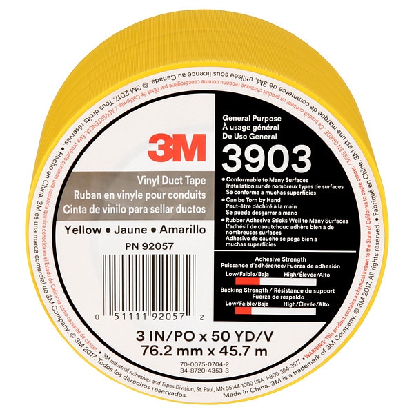 Adhesion to Steel 15.4 oz/in, Tape Brand 3M(TM), Assembly and Manufacturing, General Maintenance and Repair, Safety, Warehouse, Environment Indoor, Imperial Tape Length 50 yd, Imperial Tape Width 3 in, Continuous Roll, Series 3903, Tape Adhesive Material Rubber, Tape Backing Material Vinyl Coated Cloth, Tape Color Yellow, Tape Sub-Type General Purpose Duct Tape, Tape Thickness 6.5 mil, Duct and Repair Tape, Maximum Tape Performance Temperature 200 Degrees F, Metric Tape Length 45.7 m