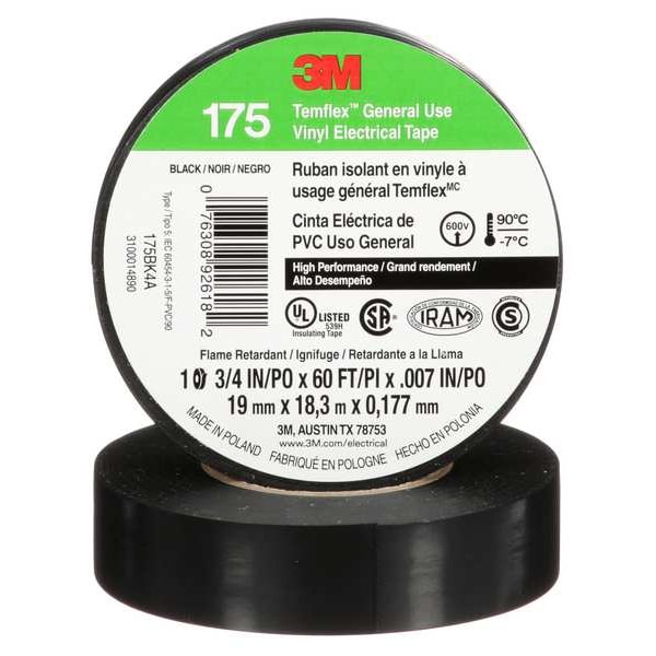 Electrical Tape, General Purpose, Vinyl, Tape Adhesive Material Rubber, 3/4 in, 20 yd, 7 mil, 3M(TM), Temflex(TM), Series 175, Black, Minimum Tape Performance Temperature 14 Degrees F, Maximum Tape Performance Temperature 194 Degrees F, Voltage Rating 600 V, Continuous Roll, Single-Sided
