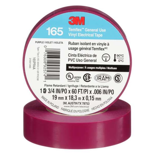 Electrical Tape, General Purpose, Vinyl, Tape Adhesive Material Rubber, 3/4 in, 20 yd, 6 mil, 3M(TM), Temflex(TM), Series 165, Purple, Minimum Tape Performance Temperature 14 Degrees F, Maximum Tape Performance Temperature 194 Degrees F, Voltage Rating 600 V, Continuous Roll, Single-Sided